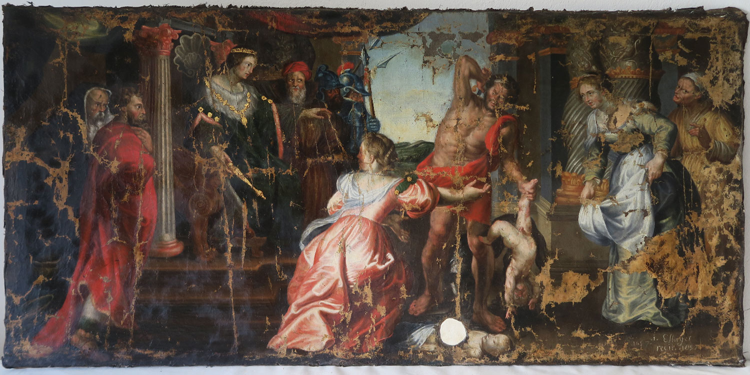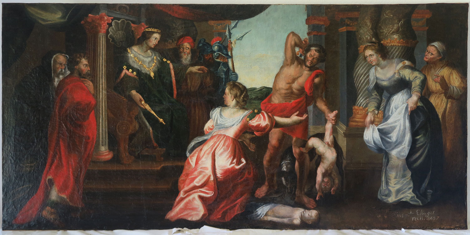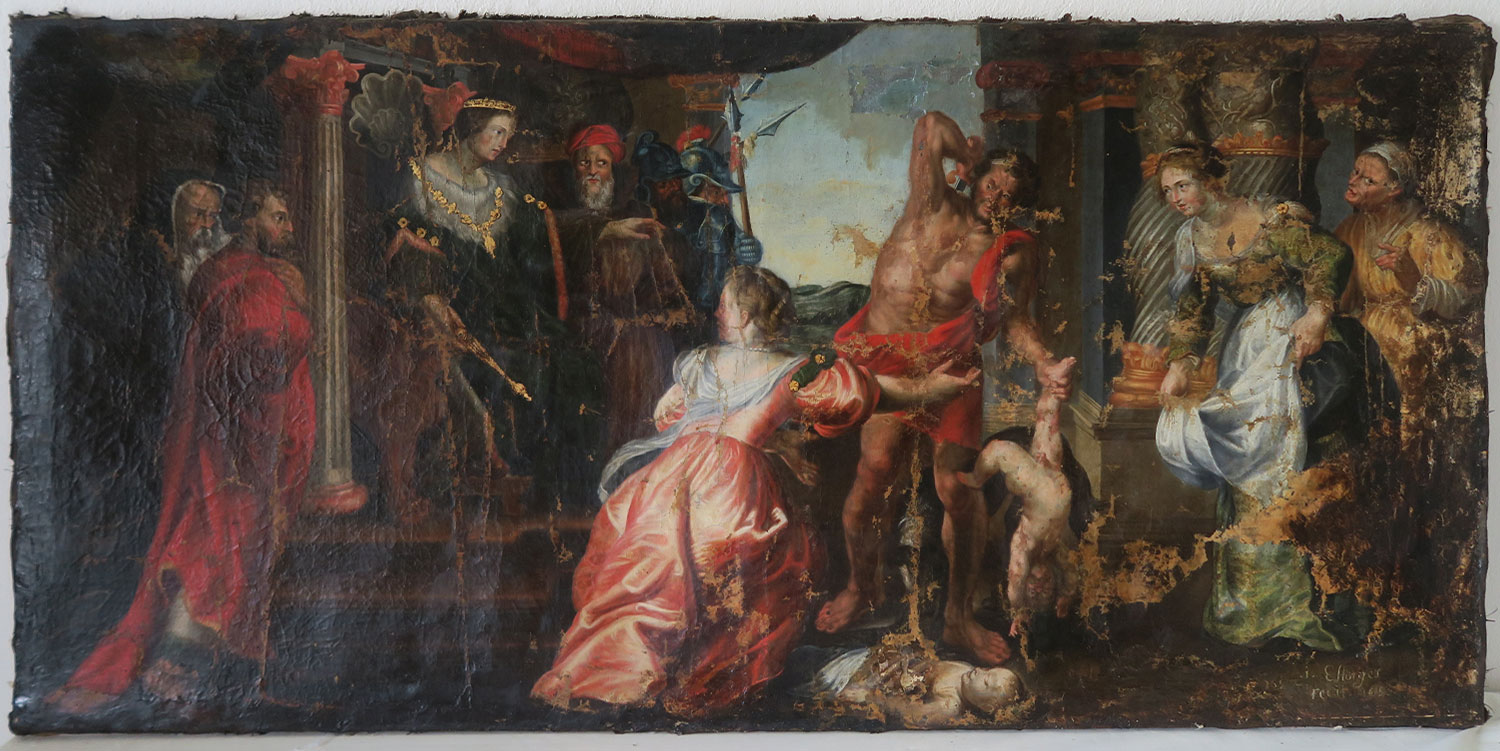 Copie du jugement de Salomon de Rubens, 170 x 85 cm, huile sur toile – avant restauration- 1697, Estorges